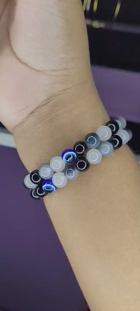 Third Eye is a versatile black, white, and grey bracelet designed for both men and women. Its centerpiece, the evil eye bead, adds a touch of protection to any outfit. Expertly crafted, this bracelet is a must-have accessory.